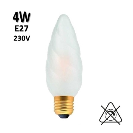 Ampoule flamme LED 230V d'une puissance de 4,5W, avec un flux lumineux de 470Lm et un petit culot à vis E14. Cette ampoule offre une finition claire ou satinée avec effet filament 2700K, créant un rendu visuel semblable à celui d'une ancienne ampoule incandescence de 40W. Garantie 3 ans.