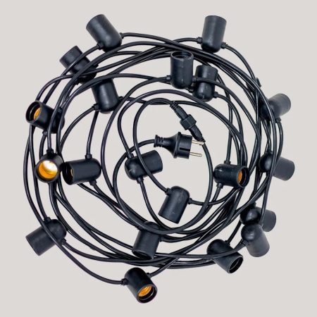 Guirlande câble plat noir longueur 10m, composée de 20 douilles pour ampoules sphériques de couleur avec culot à vis E27. Possibilité de relier plusieurs guirlandes entre elles. Souvent appelées "Guirlande de Guinguette ou guirlande foraine". Attention les ampoules sont à commander à part.