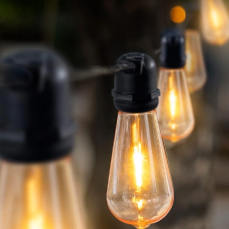 La guirlande est équipée de 20 douilles E27, compatibles avec des ampoules LED (non incluses), ce qui vous permet de choisir librement l’intensité, la température de couleur et le style d’éclairage selon l’ambiance souhaitée. Du rendu vintage chaleureux à une lumière plus moderne et épurée, tout est possible.