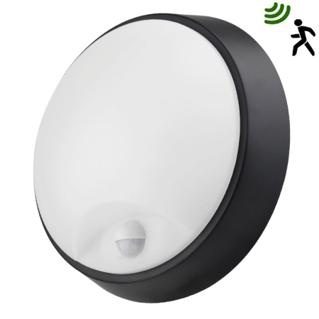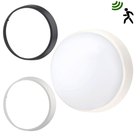 Hublot avec détecteur de présence équipé d'une plaque LED intégrée de 25W pour un flux lumineux de 1935Lm. Luminaire rond Ø300mm de couleur blanc ou noir pour une installation en intérieur ou en extérieur (IP66). INDIGO TIMY OU13930 OU13931