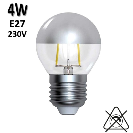 Ampoule sphérique avec une calotte argentée (éclairage indirect) filament LED 4W, petit culot à vis E14, tension 230V, température de couleur 2700K (Blanc chaud), durée de vie 30.000h. Cette ampoule LED à la même qualité d'éclairage qu'une ancienne ampoule à filament incandescent.