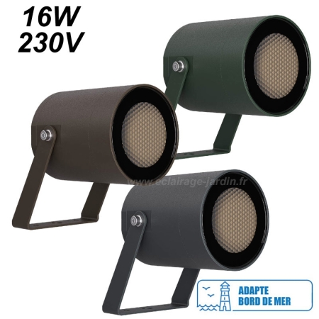 Projecteur dimmable pour extérieur, protégé contre l'eau et la poussière (IP65), adapté aux environnements salins. Équipé d'un système optique avec lentille FRESNEL en PMMA, il offre un angle de dispersion de la lumière standard de 38°. Son diffuseur en verre avec bordure noire sérigraphiée assure une diffusion homogène de la lumière. Fourni avec un connecteur IP68, il peut être équipé de lentilles de 15°, 24° ou 60° (*), ainsi que d’une base de connexion (*), d’un piquet (*), d’un dispositif anti-éblouissement en nid d'abeille (*) et d’un cache asymétrique (*).