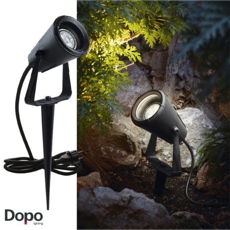 Spot sur piquet ou mural pour l'extérieur IP67, livré monté avec un câble HO7Rnf de 2m et fiche. La tête du luminaire peut pivoter sur 360°.